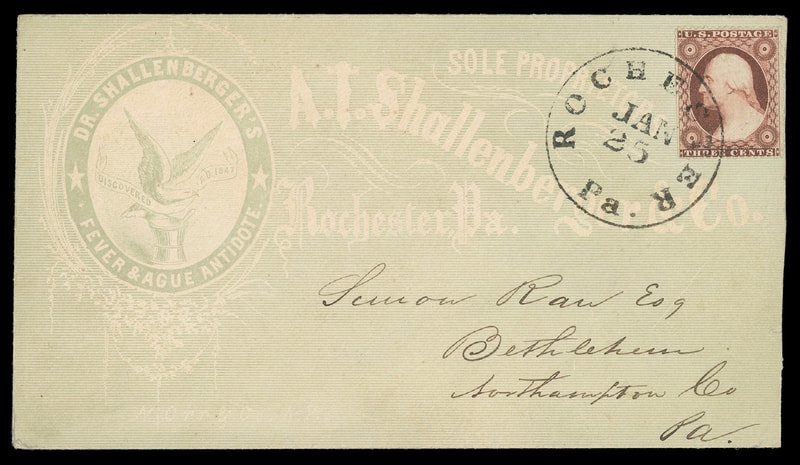 (Medical) Dr. Shallenberger Fever & Ague Antidote, Rochester Pa., green overall illustrated advertising showing eagle on cover bearing 3¢ dull red (26) , scissor trimmed at left, tied by bold "Rochester, Pa., Jan 25" cds to Bethlehem Pa., Very Fine and beautiful.