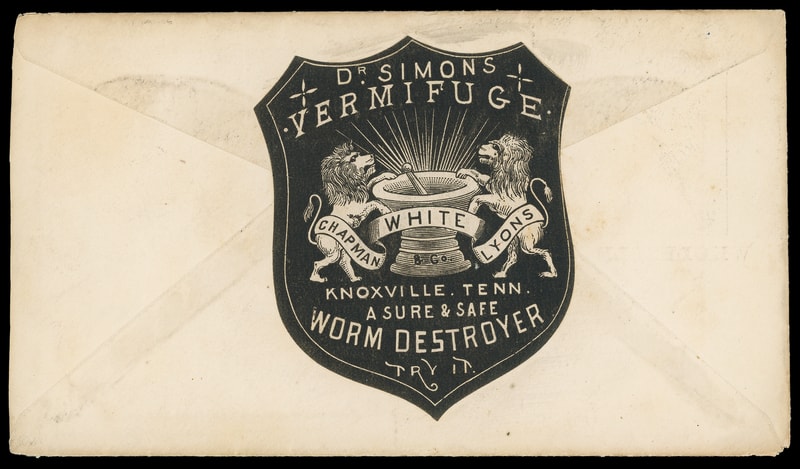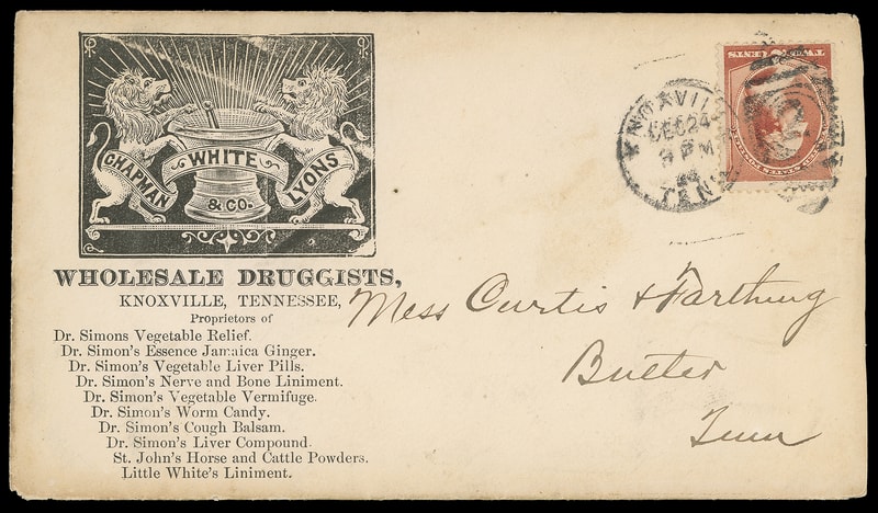 (Medical) Dr. Simons Vegetable Relief, Wholesale Druggists, Knoxville, Tenn., overall illustrated advertising showing Lions around Mortar & Pestle, additional matching shield flap label seal on cover bearing 2¢ red brown (210) tied by "Knoxville, Tenn. Dec 24" cds duplex to Butler, Tenn.; some edge wear, reduced slightly at right, Very Fine.