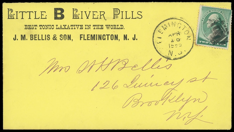 (Medical) Little B Liver Pills, J.M. Bellis & Son, Flemington N.J., fancy corner card advertising with "Best Tonic Laxative in the World" slogan on radiant yellow cover bearing 2¢ green (213) canceled by segmented cork cancel duplexed with "Flemington, N.J. Apr 10, 1888" cds to Brooklyn N.Y., Apr. 15th 1888 arrival backstamp; 2¢ barely affected from edge placement, Very Fine and attractive.