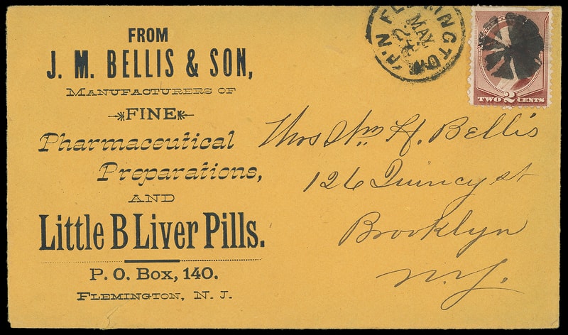 (Medical) Little B Liver Pills, J.M. Bellis & Son, Flemington, N.J., advertising on orange cover bearing 2¢ brown (210) canceled by bold segmented cork cancel duplexed with "Flemington N.J. May 24" cds to Brooklyn N.Y., reverse with May 25th arrival backstamp and pencil 1886 docketing; small bottom edge tear, Very Fine.