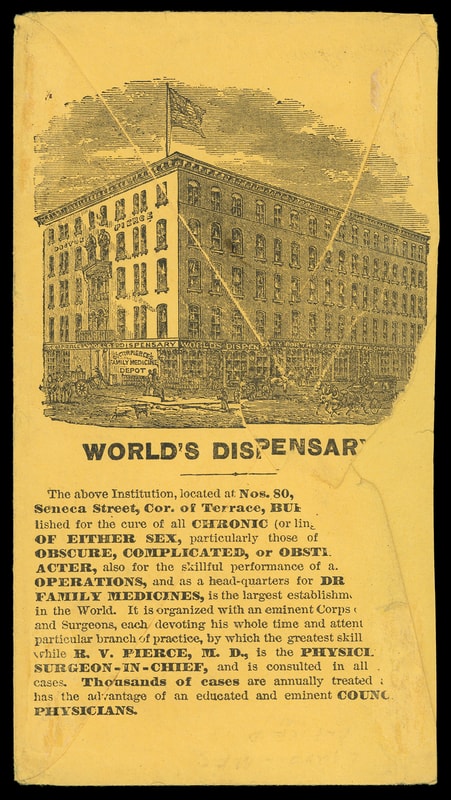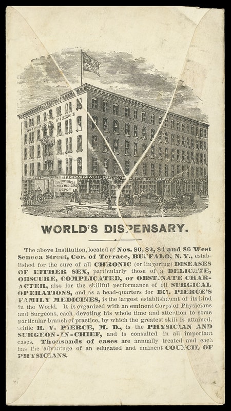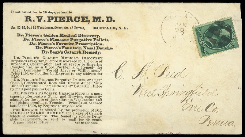 (Medical) Dr. Pierce's Golden Medical Discovery, R.V. Pierce M.D., Buffalo N.Y., text advertising on cover with additional illustrated building design showing World Dispensary building on reverse, bearing 3¢ green (184) , small tear, canceled by six-bar circular grid cancel duplexed partial "Buffalo N.Y. Jan 28" cds to West Springfield Pa.; reduced slightly at right, light soiling, scarce and F.-V.F.