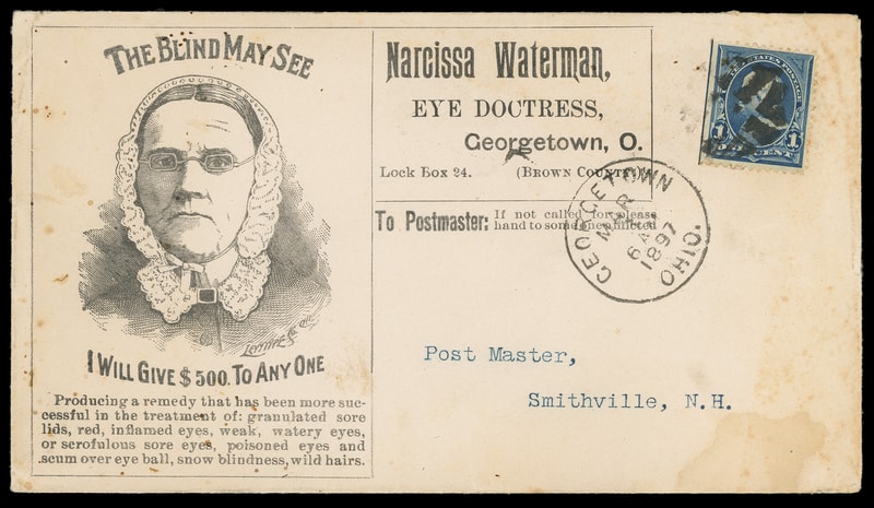 (Medical) Narcissa Waterman, Eye Doctress, Georgetown Ohio, near overall illustrated "The Blind May See, I Will Give $500 to Anyone" advertising showing Elderly Woman with Eyeglasses on cover bearing 1¢ blue (264) tied by segmented cork duplexed with "Georgetown, Ohio Mar 3, 1897" cds to Smithville N.H.; faint stains and creasing at right, F.-V.F.