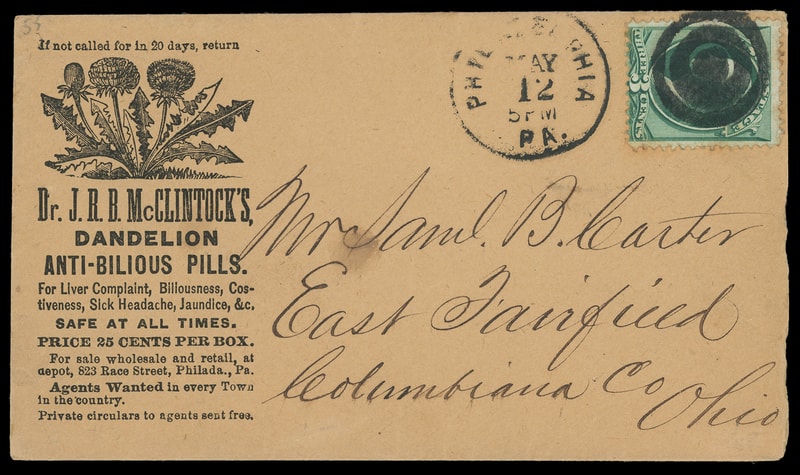 (Medical) Dandelion Anti-Bilious Pills, Dr. J.R.B. McClintock, Philsdelphia Pa., illustrated advertising showing dandelions on buff cover bearing 3¢ green (184) tied by bold target cancel duplexed with "Philadelphia, Pa. May 12" cds to East Fairfield Ohio.; reduced slightly at right, Very Fine.