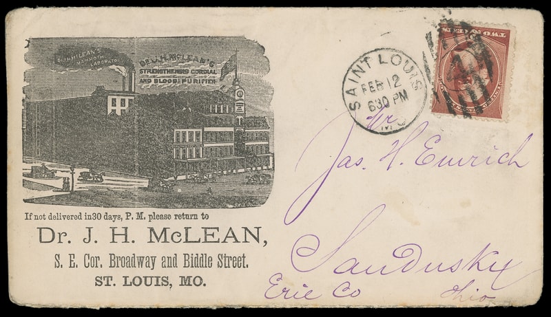 (Medical) Dr. J.H. McLean's Strengthening Blood Purifier, Dr. J.H. McLean, St. Louis Mo., large illustrated building advertising on cover bearing 2¢ red brown (210) tied by "St. Louis, Mo. Feb 12" duplex to Sandusky, Ohio; edge wear, F.-V.F.