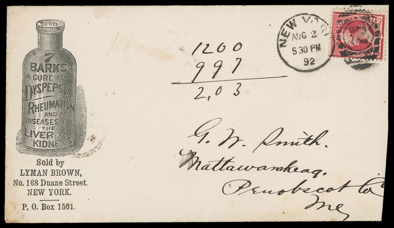 (Medical) 7 Barks A Cure for Dyspepsia, Lyman Brown, New York, illustrated advertising showing medicine bottle on cover bearing 2¢ carmine (220) tied by "New York, Aug 2 '92" duplex to Mattawamkeag, Maine; reduced at right, some number tallying, F.-V.F.