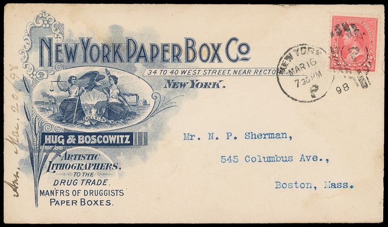 (Medical - Druggist) New York Paper Box Co., Artistic Lithographers to the Drug Trade, New York N.Y., beautiful illustrated design on cover bearing 2¢ pink (279Bc) tied by "New York, Mar 16 '98" duplex to Boston Mass.; slightly rough opening at right, otherwise Very Fine.