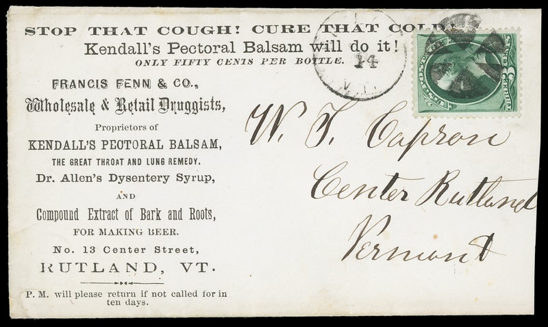 (Medical) Kendall's Pectoral Balsam Will Do It, Francis Fenn & Co., Rutland, Vt., printed advertising on cover bearing 3¢ green (158) well centered, tied by neat circle of wedges cancel duplexed with "Rutland Vt." cds to Center Rutland Vt.; reduced at right, F.-V.F.