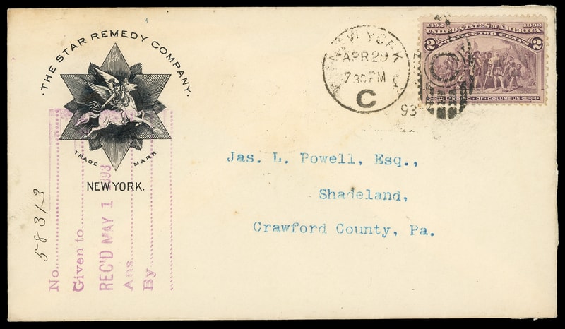 (Medical) The Star Remedy Co, New York, illustrated design on amber cover bearing 2¢ Columbian (231) tied by "New York, C, Apr 29 '93" duplex to Shadeland Pa., 1893 arrival backstamp, purple May 1, 1893 company receiving handstamp, Very Fine.