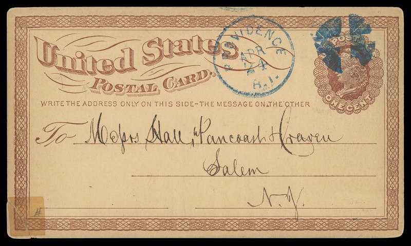 (Medical) Dr. Flint's Quaker Bitters, H.S. Flint & Co., Providence, R.I., illustrated advertising showing Dr. Flint on reverse of 1¢ postal (UX3) canceled by blue quartered cork duplexed with "Providence, R.I. Apr 24" cds to Salem, N.Y., 1877 message dating; lower left corner hinged in place, Fine and scarce early illustrated medical on a postal card.