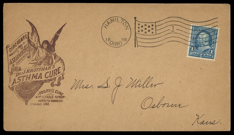 (Medical) Dr. J. Kauffman's Asthma Cure, ornate brown illustrated ad design showing Angel on unsealed brown cover bearing 1¢ blue (284) tied by "Hamilton, Ohio 1898" machine flag cancel to Osborne, Kansas at the printed matter rate, Very Fine.