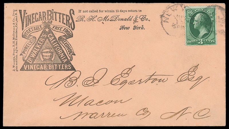 (Medical) Dr. Walker's California Vinegar Bitters, R.H McDonald & Co, N.Y., illustrated design on 1874 salmon cover bearing 3¢ green (158) tied by "New York, Jun 15" cds duplex to Macon N.C., 1874 docketing on reverse, Very Fine and choice.