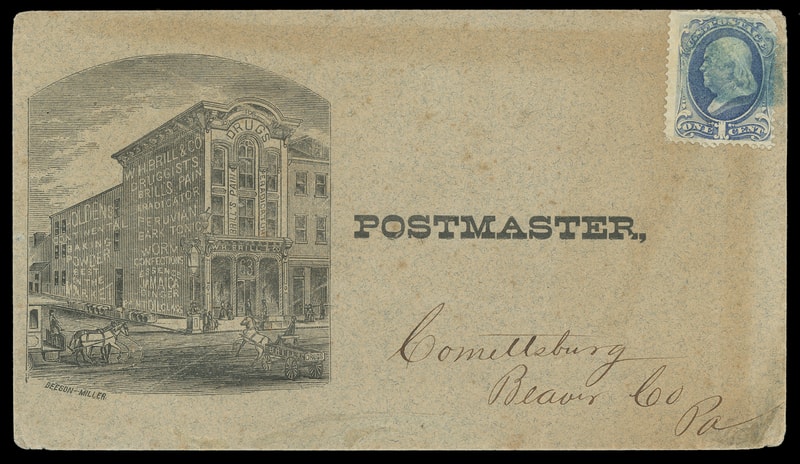 (Medical) Brill's Pain Eradicator, W.B. Brill & Co., illustrated building advertising design on unsealed gray cover bearing 1¢ ultramrine (156) tied by blue cork to the Postmaster, Comettsburg, Pa.; cover toning, 1¢ corner flaw, Fine and attractive.