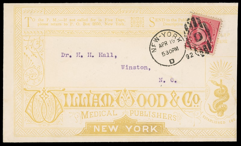 (Medical) William Wood & Co., Medical Publishers, New York N.Y., overall yellow illustrated advertising showing snake on 1892 cover bearing 2¢ carmine (220) tied by "New York, D, Apr 19 '92" duplex to Winston N.C.; reduced at right, otherwise fresh and Extremely Fine.