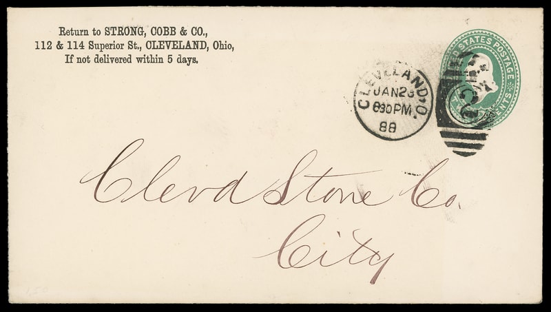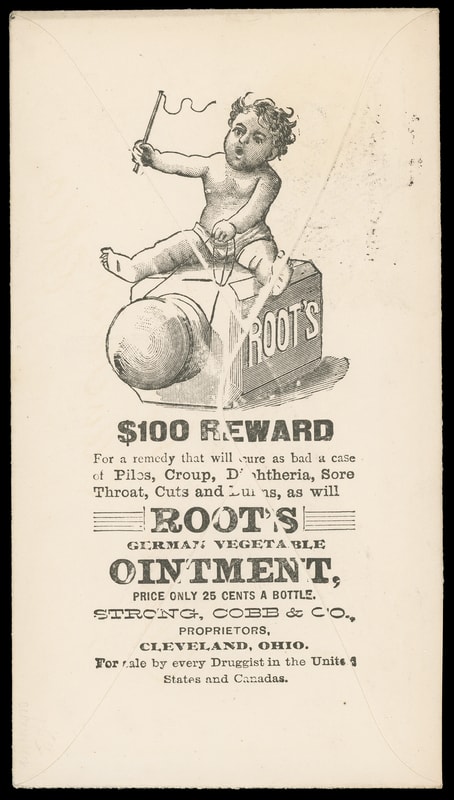 (Medical) Root's Vegetable Ointment, Strong Cobb & Co., Cleveland Ohio, overall illustrated advertising showing baby on medicine bottle on reverse of 2¢ green entire canceled by "Cleveland, O. Jan 23 '88" duplex to local address, Extremely Fine.