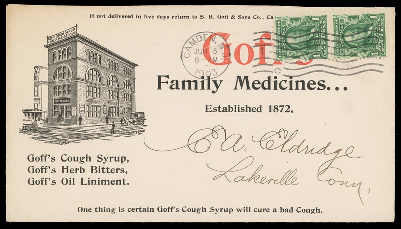 (Medical) Goff's Family Medicines, S.B. Goff & Sons Co., Camden N.J., bicolor illustrated building advertising on clean cover bearing 1¢ green (300) vertical pair tied by "Camden, N.J. Jun 5, 1903" machine cancel to Lakeville, Conn., Very Fine and attractive.