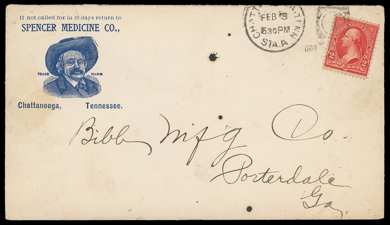 (Medical) Spencer Medicine Co., Chattanooga, Tenn., blue illustrated corner card showing man with hat on cover bearing 2¢ red (279B) tied by "Chattanooga, Tenn. Sta A, Feb 3, 1903" duplex to Porterdale Ga.; few stain spots, F.-V.F.