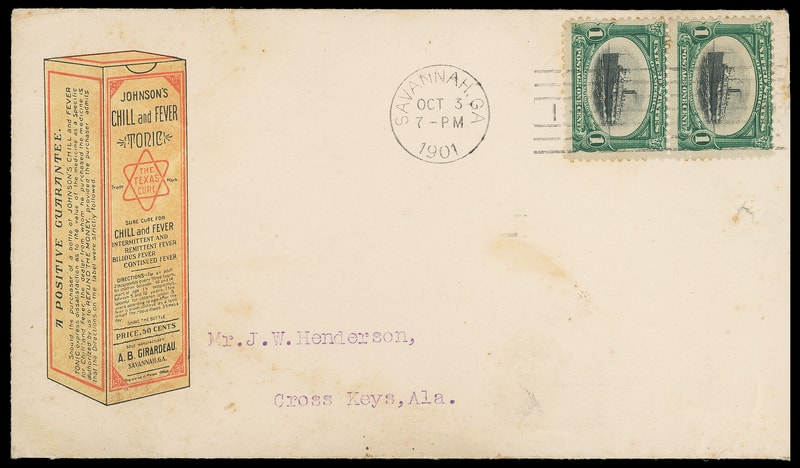 (Medical) Johnson's Chill and Fever Tonic, A.B. Girardeau, Savannah Ga, bicolor illustrated advertising showing medicine box for "The Texas Cure" on cover bearing 1¢ Pan-American (294) vertical pair tied by "Savannah, Ga. Oct 3, 1901" machine cancel to Cross Keys Ala.; small spindle hole, reduced slightly at right, F.-V.F.