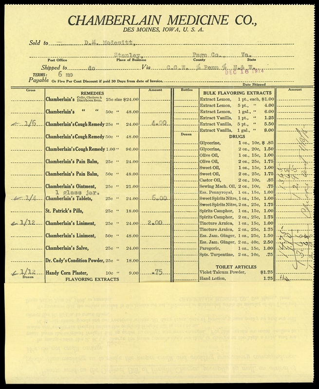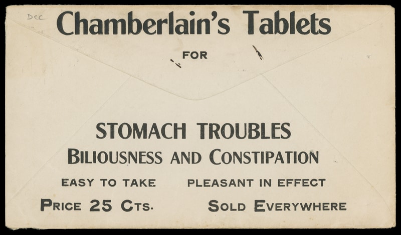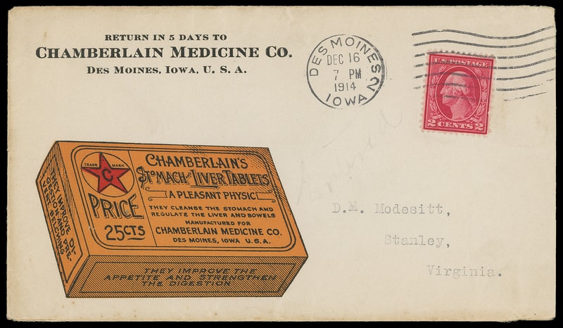 (Medical) Chamberlain Medicine Co, Des Moines, Iowa, bicolor illustrated advertising showing "Chamberlains's Stomach and Liver Tablets" medicine box with additional text advertising on reverse of cover bearing 2¢ Washington (429) tied by "Des Moines, Iowa, Dec 16, 1914" machine cancel to Stanley Va., with enclosed invoice for $14.25; reduced slightly at right, Very Fine.