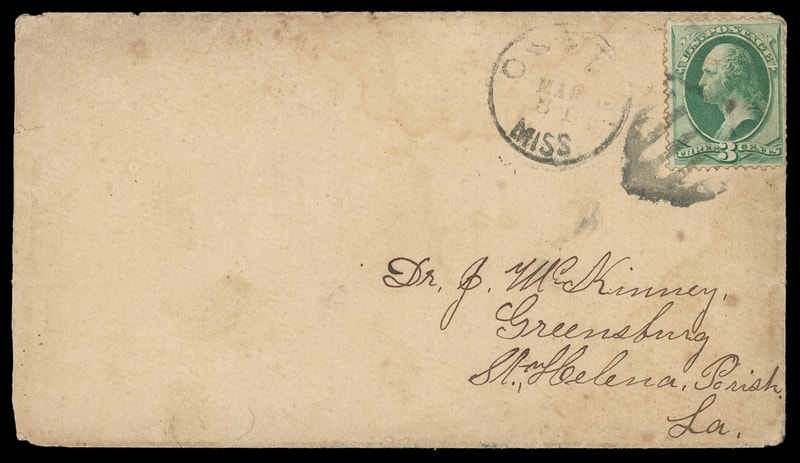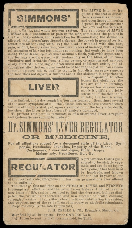 (Medical) Simons' Liver Regulator, J.H. Zeilin Co, Druggists, Macon Ga., overall advertising on reverse of cover bearing 3¢ green (147) tied by partial shield fancy cancel duplexed with "Owasco, Miss. Mar 31" cds to Greensburg, La.; wear and soiling, Fine.