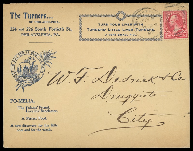 (Medical) The Turners, Philadelphia, Pa., blue illustrated designs including boxed "Turn Your Liver With Turners' Little Liver Turners. A Very Small Pill" slogan on larger size buff cover bearing 2¢ red (279B) tied by "Winston, Jun 9 '97" duplex to local address; barely perceptible file fold, Very Fine.