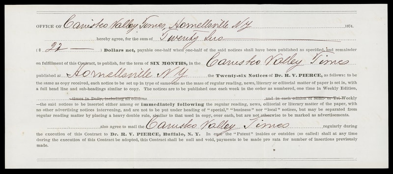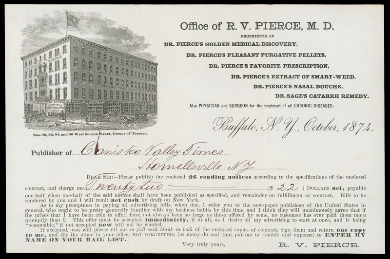 (Medical - Druggist) R.W. Pierce M.D., World's Dispensary, Buffalo N.Y., text advertising and reverse with illustrated building ad on orange cover bearing 6¢ rose pink (159) tied by quartered cork duplexed with "Buffalo N.Y. Oct 31" cds to Hornellsville N.Y., matching illustrated building letterhead enclosure; cover reduced slightly at top, part of flap missing, Very Fine.