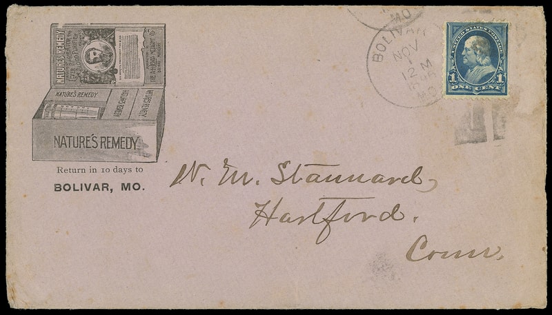 (Medical) Nature's Remedy, The A.H. Lewis Medicine Co., Bolivar Mo., illustrated corner card ad showing Nature's Remedy sales box on light purple cover bearing 1¢ blue (264), perf faults, tied by "Bolivar Mo., Nov 1, 1896" duplex to Hartford Conn.; some edge wear and light creasing, F.-V.F.