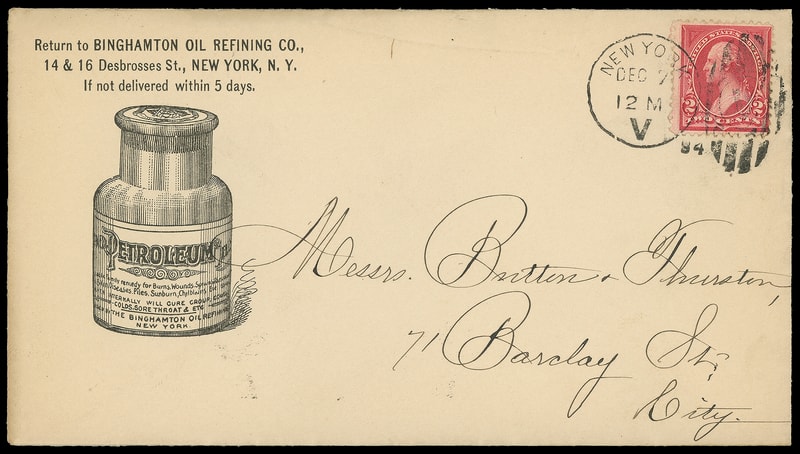 (Medical) Petroleum Jelly, Binghampton Oil Refining Co., New York N.Y., illustrated ad design showing medical bottle on 1894 cover bearing 2¢ carmine lake (249) tied by "New York 'V' Dec 7 '94" duplex to local street address, Dec. 7th machine receiving cds, Very Fine.
