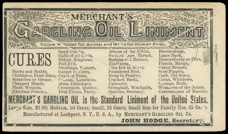 (Medical) Merchant's Gargling Oil Liniment, Lockport N.Y., overall ad on reverse of J.E. Jones dealer in Fine Cabinet Minerals, Fossils, and General Curiosities corner card cover bearing 2¢ red brown (210) tied by "St. Johnsbury Vt. May 26" duplex to Bristol Conn.; reduced slightly at right, Very Fine.