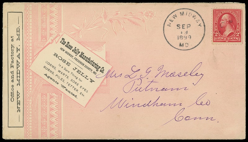 (Medical) The Rose Jelly Manufacturing Co., New Midway Md., pink overall illustrated shaded ad design on cover bearing 2¢ red (279B) guideline s.e., light cancel duplexed with neat "New Midway Md. Sep 19, 1899" cds to Putnam Conn., Sep. 20th arrival backstamp, Very Fine and attractive.