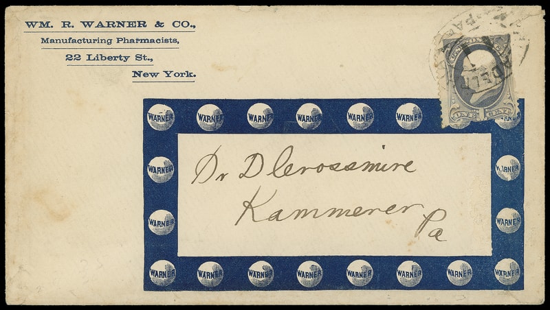 (Medical - Pharmacist) Wm. R. Warner & Co., Manufacturing Pharmacists, New York N.Y., blue advertising design with fancy "Warner" address frame on unsealed cover bearing 1¢ gray blue (206) tied by "Philadelphia Pa." third-class oval to Kammerer Pa., erosion affects cover and stamp at right, small restored top edge nick, Fine appearance.