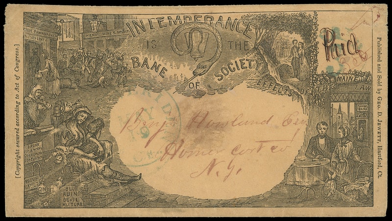 (Medical - Temperance) "Intemperance is the Bane of Society", overall illustrated intemperance advertising on orange cover with blue "Meriden Ct. May 19" cds with matching "Paid 3" rating handstamp to Homer Centre N.Y., additional manuscript "Paid 3cts" with pointing hand; light wax seal stain, stain in address panel, still attractive and F.-V.F.