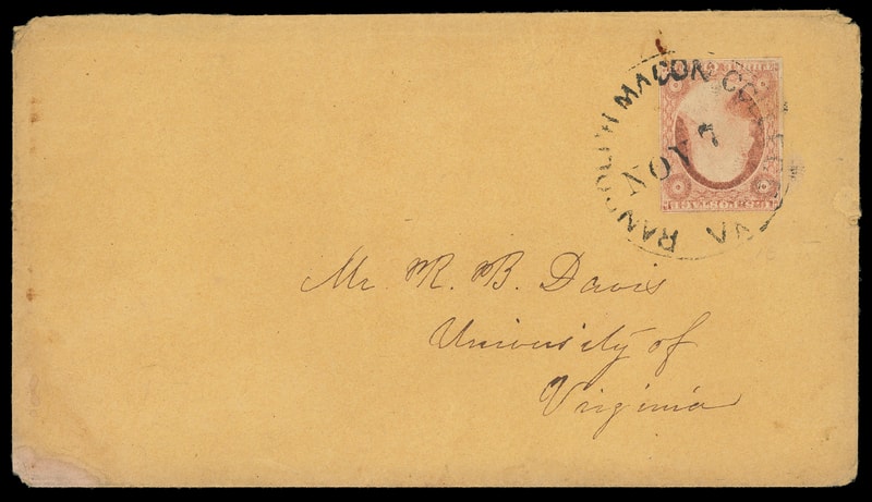 Randolph Macon College, Va. Nov 7, balloon-style cds ties 3¢ dull red (11A) , on orange cover to the University of Virginia; some corner wear and small stain, F.-V.F. and scarce college town cancel.