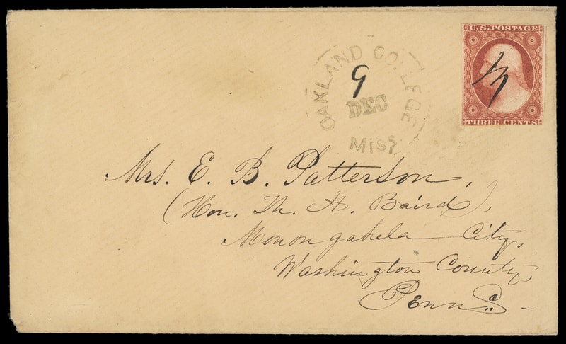 Oakland College, Miss. '9' Dec, cds with ms. day and matching ms. squiggle canceling 3¢ orange brown (10A) , margins to in, on buff cover to Monongahela City Pa.; reduced slightly at left, F.-V.F. and scarce Mississippi college town cancel.
