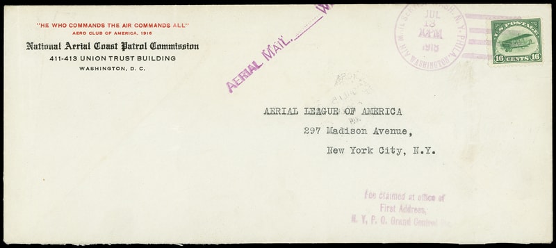 Airmail, 1918, 16¢ green, tied by purple "Air Mail Service, Wash. N.Y., Phila., Washington, Jul 13, 1918" duplex on legal-size National Aerial Coast Patrol Commission imprint cover to New York City, purple "Aerial Mail." straightline cachet, held for May 15th flight, New York (7.15) arrival backstamp, Very Fine.