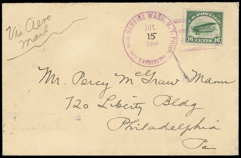 Airmail, 1918, 16¢ green, tied by purple "Air Mail Service, Wash. N.Y., Phila., Washington, Jul 13, 1918" duplex updated in ms. to "15", on buff cover to Philadelphia Pa.