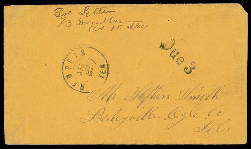 Memphis Ten. Jan 25, 186, double-circle cds with matching "Due 3" rating on orange cover endorsed "Sol Letter, B., Col 46 Ills." addressed to Baleyville Ills.; reduced sligthtly at right, F.-V.F. Tennessee Soldier's Letter, ex-Gallagher .