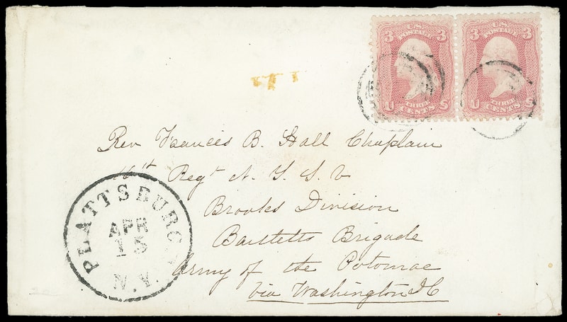 "Brooks Division, Bartells Brigade, Army of the Potomac, via Washington", part of full military addressed cover bearing 3¢ rose (65) pair tied by target cancels, matching "Plattsburg N.Y. Apr 15" cds to "Rev Francis B. Hall Chaplain, 10th Regt N.Y.S.V., Brooks Division, Bartells Brigade, Army of the Potomac, via Washington", fresh and Very Fine.