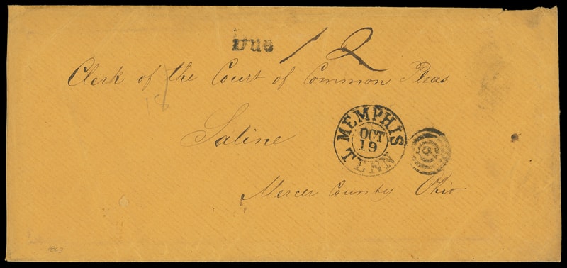 1863 (Oct. 19) Memphis, Tenn. to Saline, Ohio, circa 1863 legal-size orange cover with bold "Memphis, Tenn. Oct 19" duplex and matching " Due " handstamp with ms. " 12 " rating for double-rate, doubled again for penalty (Act eff. July 1, 1863, Section 26) as no "Soldier's Letter" endorsement present, F.-V.F., ex-Graham (photocopy of exhibit page) .