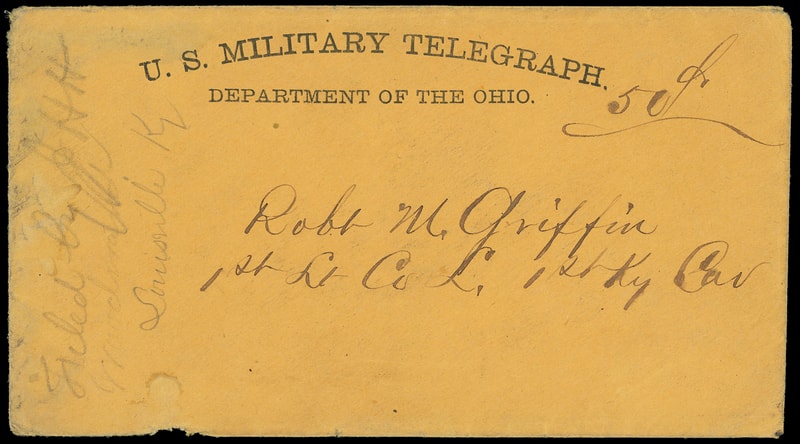 U.S. Military Telegraph, Department of the Ohio, circa Feb. 1862 orange imprint cover with " 50¢ " rating addressed to Robt. M. Griffin, 1st Lt. Co. L., 1st Ky Cav., pencil "Filed by AHH, Louisville Ky." at left, F.-V.F., ex-Kramer .