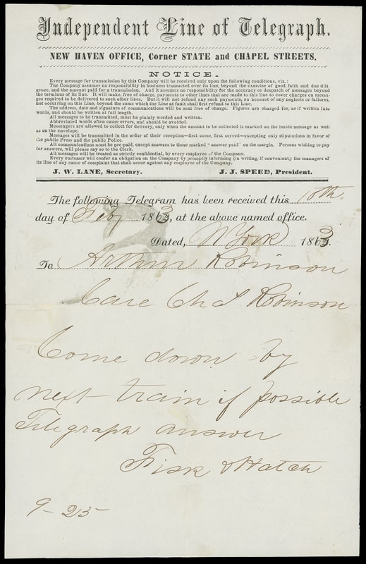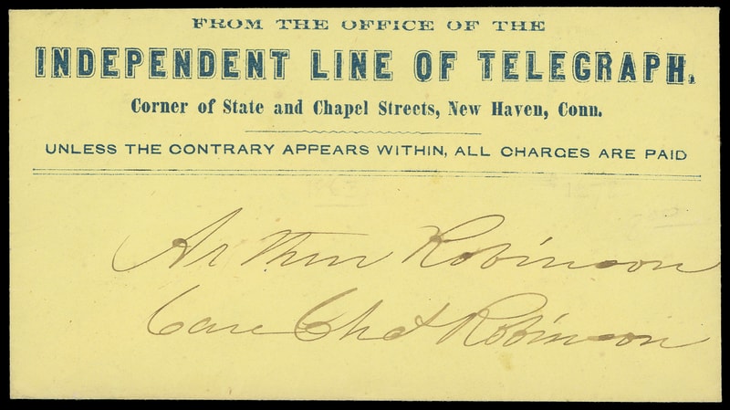 Independent Line of Telegraph, New Haven Conn., blue imprint on yellow cover with original Feb. 16th 1863 telegraph from New York City with "Come down by next train if possible, Telegraph answer" message to Arthur Robinson, fresh and Very Fine.