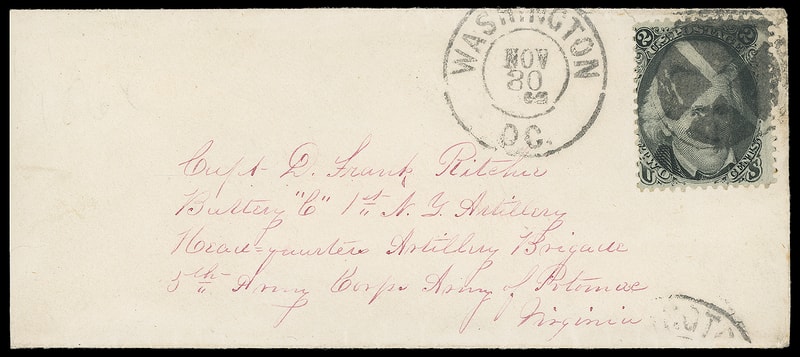 1863 (Dec. 13) Washington D.C. to Army of the Potomac, Virginia, narrow cover bearing 2¢ black (73) straddle s.e. tied by four-rings duplexed with "Washington D.C. Dec 13" cds addressed to Capt. D. Frank Ritchie, Battery "C" 1st N.Y. Artillery, Headquarters Artillery Brigade, 5th Army Corps, Army of Potomac, Virginia; reduced slightly at left with small tear, Very Fine.