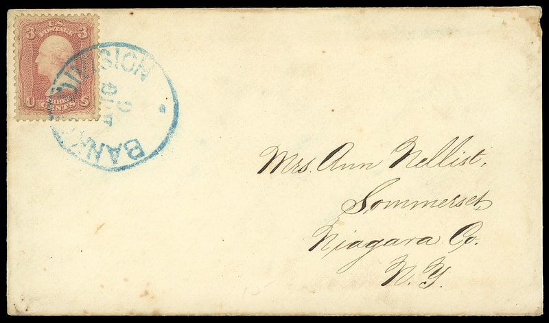 Banks Division, Aug 6, neat blue cds ties 3¢ rose (65) on cover to Somerset N.Y.; reduced slightly at right, Very Fine field post use.