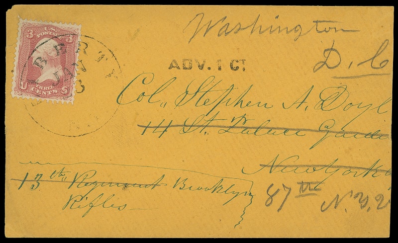 1862 (Jan. 23) Liberty N.Y. to New York City seeking Officer, orange cover beainrg 3¢ rose (65) tied by "Liberty N.Y. Jan 23" cds to Col. Stephen A. Doyle, 13th Regiment Brooklyn Rifles, 14th St. Palace Gardens, New York City, sharp Advertised "ADV. 1 Ct." straightline, reverse with "Yorkville N.Y., Apr 2, 1862" cds and pencil "Not Called For", forwarded to 8th N.Y.V., Washington D.C.; back slit open, reduced at right, F.-V.F.
