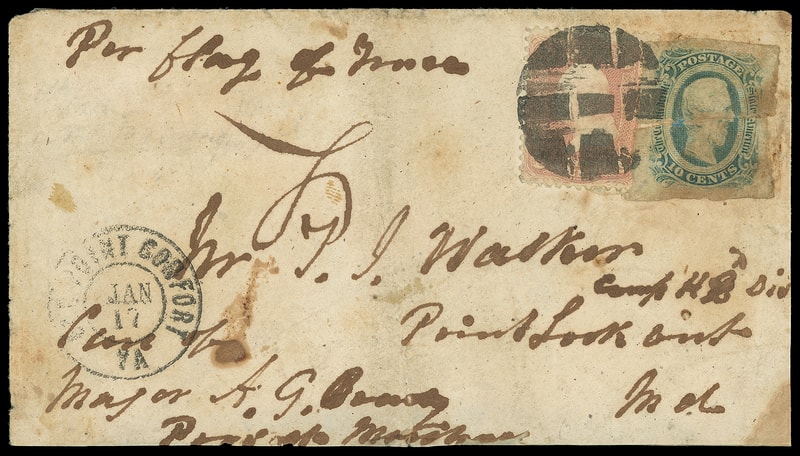 Point Lookout, Md., incoming prisoner of war cover endorsed " Per Flag of Truce " at top bearing CSA 10¢ blue (12) and U.S. 3¢ rose (65) , both tied by segmented cork, matching bold "Old Point Comfort Va. Jan 17" cds addressed to CSA Prisoner T.J. Walker, comp 42nd Div, Point Lookout, Md., Care of Major A.G. Brady, Provost Marshal", large manuscript " L " examined marking; CSA 10¢ split prior to use, bottom backflap added, Fine and scarce, ex-Hedrin .