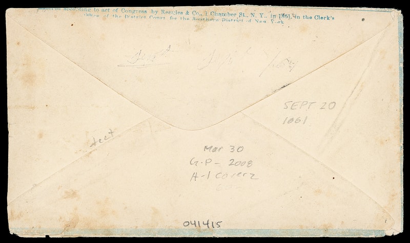 The Loyal States, Union, Massachusetts, blue overall design with "Reagles & Co." flap imprint on cover endorsed "Soldier's Letter" entering mails with "Washington D.C. Sep 20, 1861" cds and "Due 3" circular rating handstamp to West Newbury Mass.; small edge flaws and wear, reduced slightly at right, F.-V.F.