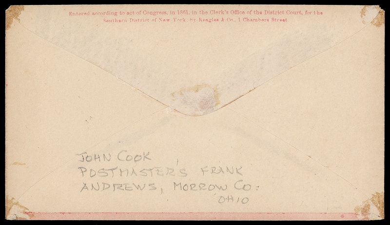 The Loyal States, Union, Ohio, red overall design with "Reagles & Co." flap imprint on cover with manuscript " Andrews O. Nov 6 " postmark and " P.O.B. free, John Cook, P.M. " free frank endorsement to Philadelphia Pa.; edge wear, Very Fine.