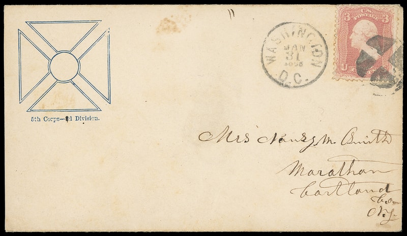 5th Corps - 2d Division, blue Maltese cross patriotic design with Clagston flap imprint on buff cover bearing 3¢ rose (65) , perf flaw, tied by quartered cork duplexed with "Washington D.C., Jan 31, 1863" cds to Marathon N.Y., F.-V.F. and scarce regimental design.