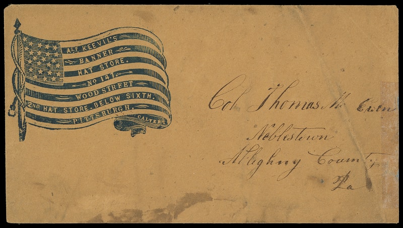 Patriotic advertising, large blue flag on orange cover with advertising between the stripes for "A L.F. Keevil' Banner Hat Store…Pittsburgh, Pa", no postal markings but obviously used, scarce advertising type, overall soiling and diagonal crease, F.-V.F.