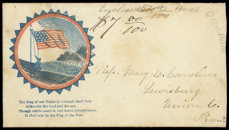Flag and Encampment, red and blue patriotic design on Adams Express money cover to Lewisberg, Pa., manuscript "$7.00" at top and red seals on reverse, enclosures include "Adams Express Co." receipt for $7.00 datelined "Hagerstown, Oct 6 1862", original letter on patriotic stationery mentioning payday and enclosing $7.00.; reduced at right, Very Fine and scarce Civil War design.