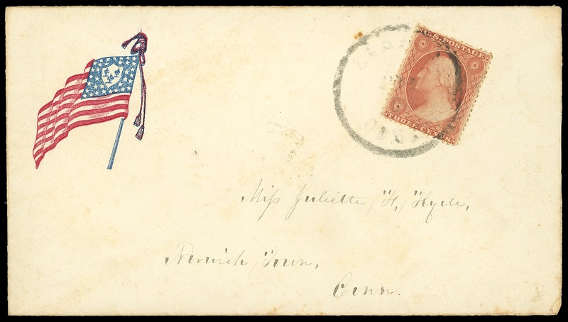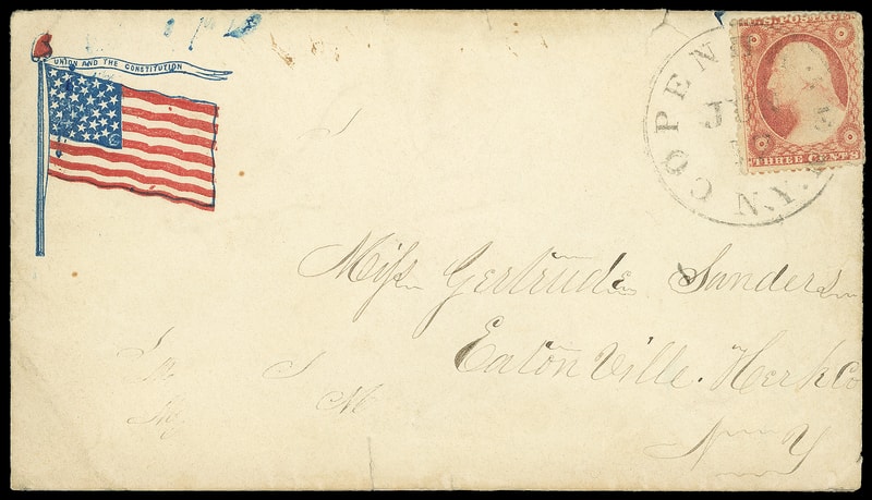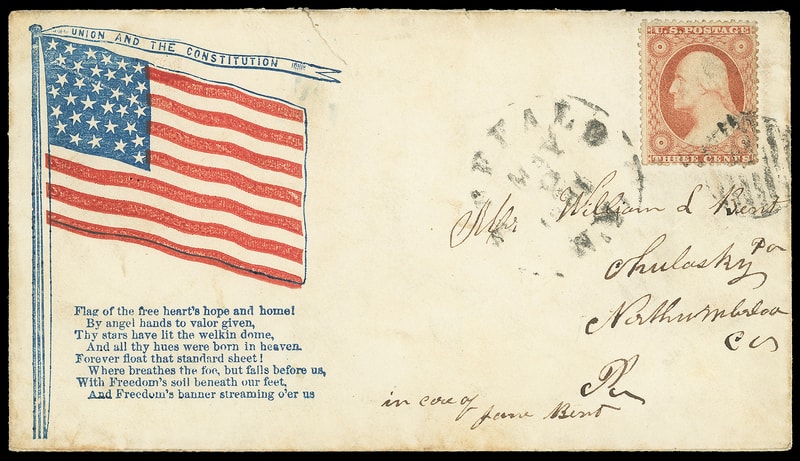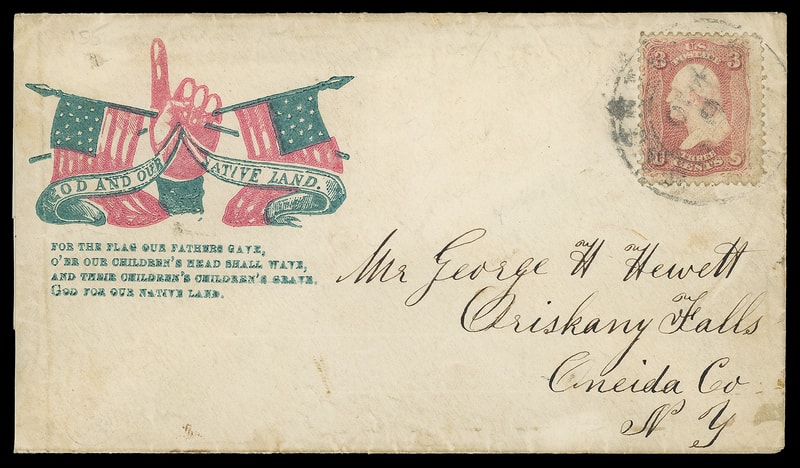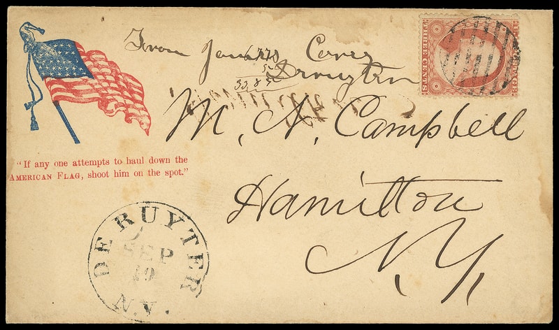 Flag with Verse, red and blue patriotic design with "If any one attempts to haul down the American Flag, shoot him on the spot." below on buff cover bearing 3¢ dull red (26) tied by circular grid cancel, matching "De Ruter N.Y., Sep 19" cds to Hamilton N.Y.; some light staining, F.-V.F.